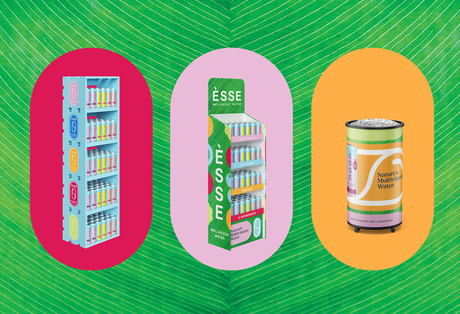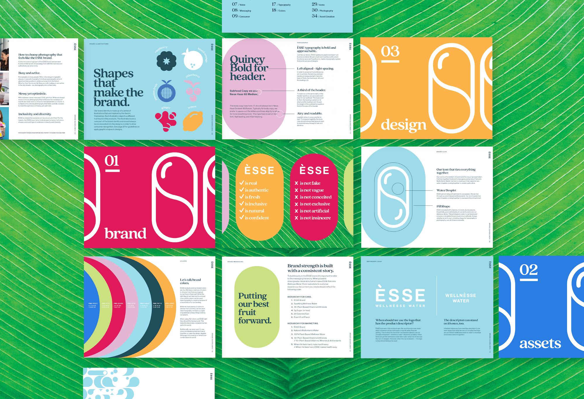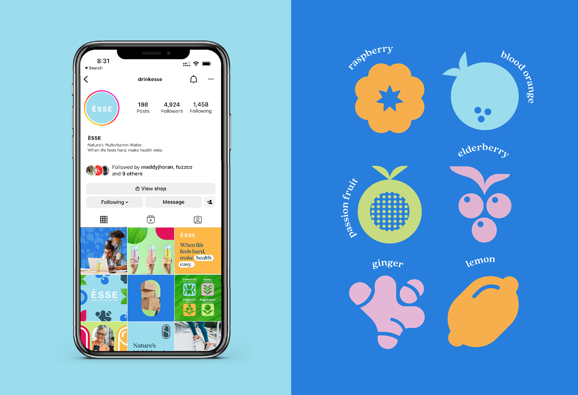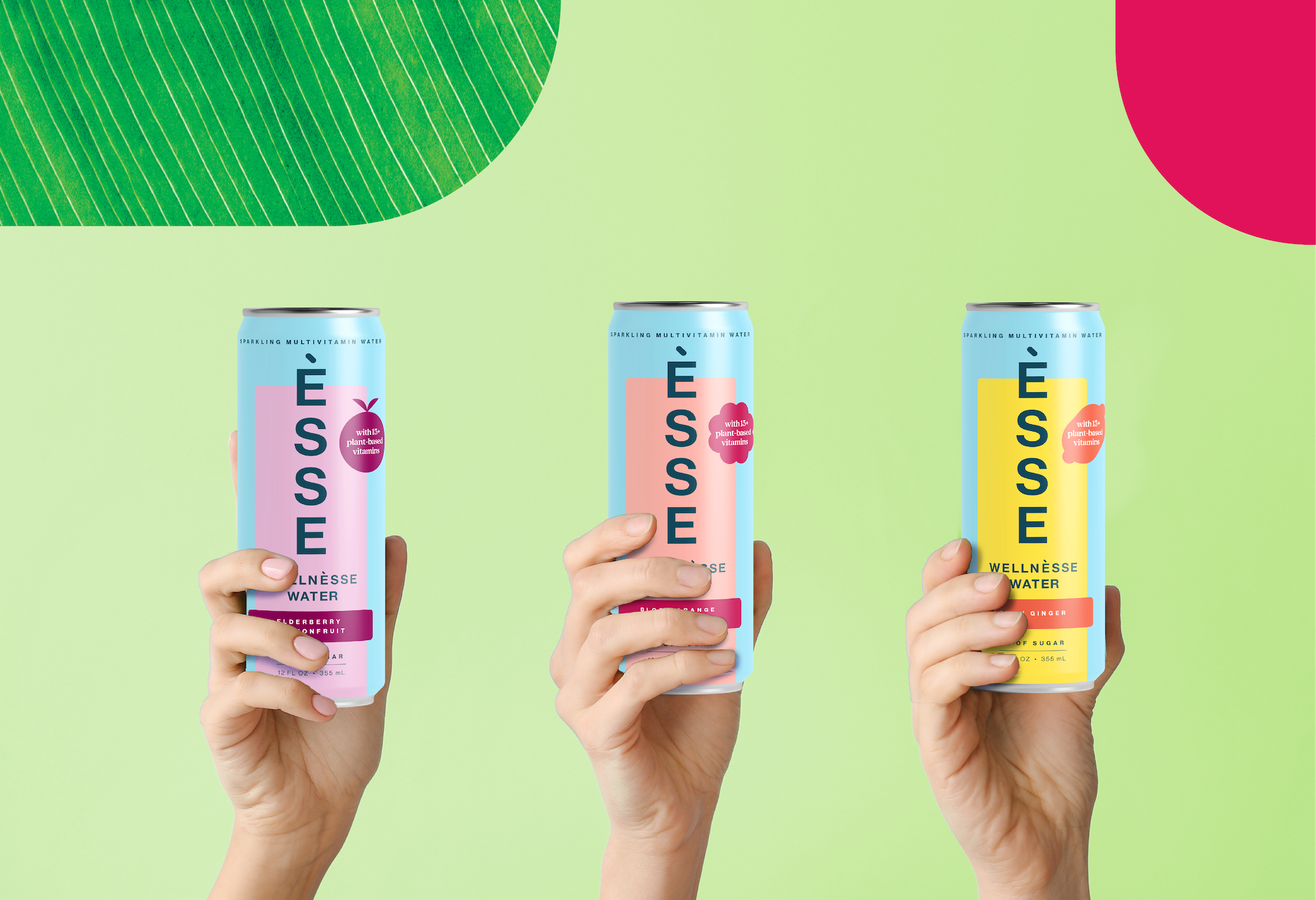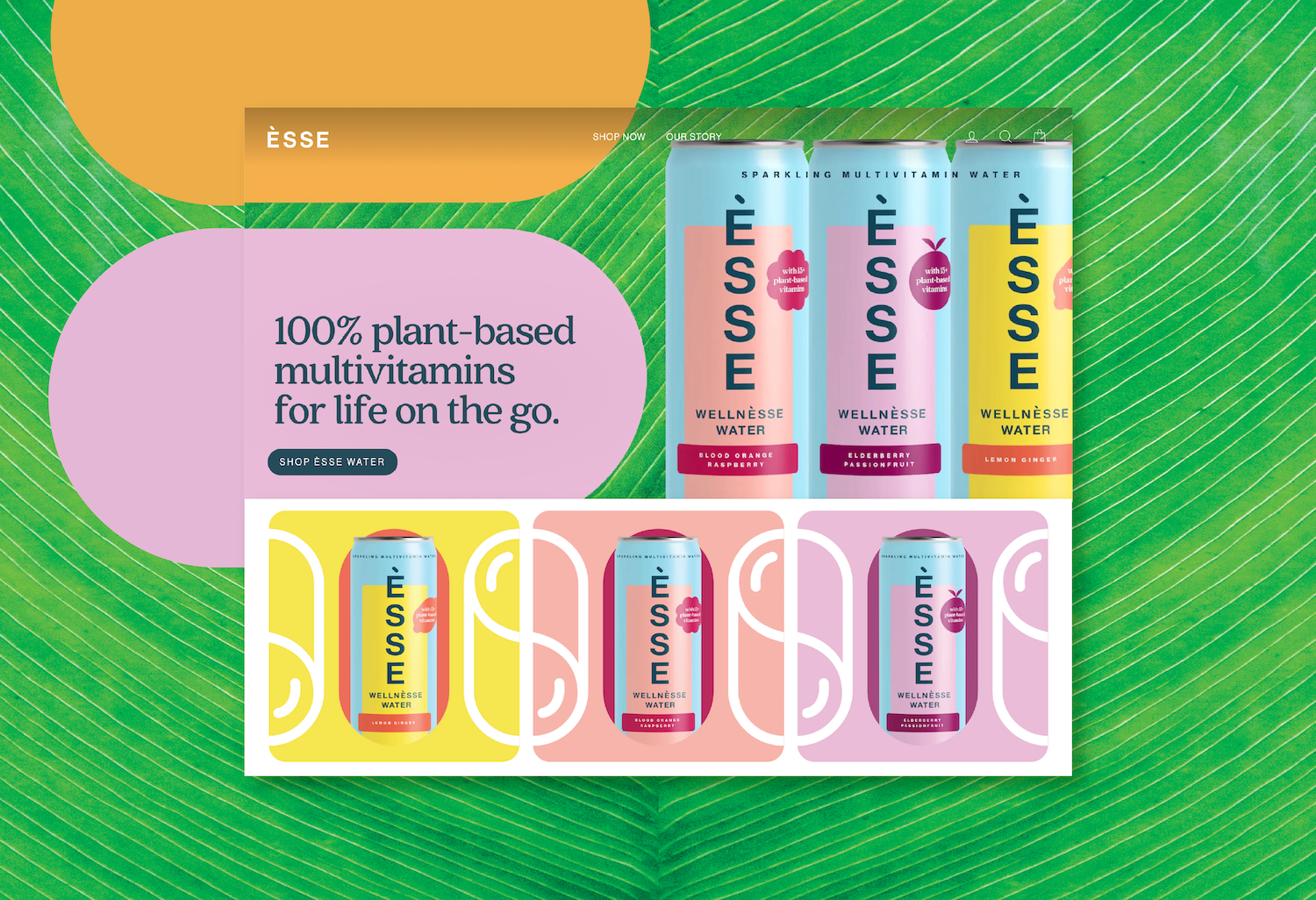 ÈSSE is Nature's Multivitamin Water. Packed with 15+ plant-based vitamins, minerals, and antioxidants, ÈSSE makes health easy when life feels hard. Izzy Jones Design, Co. gave the sparkling beverage brand a cohesive and consistent visual identity system that celebrated ÈSSE's clean and plant-based ingredients while keeping the brand personality real and transparent.